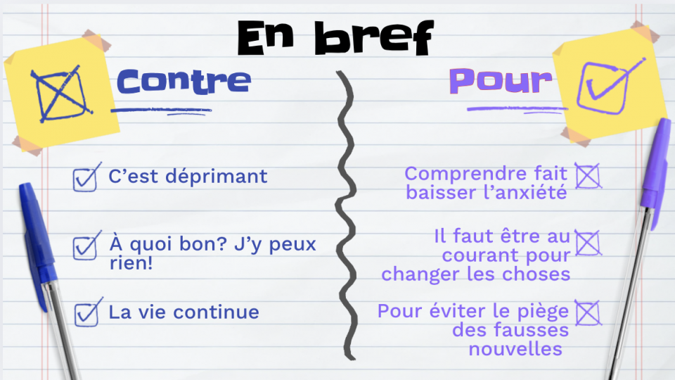 C’est prouvé par des études: quand on saisit bien un enjeu, le niveau de stress diminue. C’est l’inconnu et l’incompréhension qui font peur. Être informé t’aide à te sentir plus en contrôle. En plus, on fait bien attention à ce qu’on écrit, et on ne publie pas d’images choquantes. On te donne l’essentiel de la nouvelle, point.