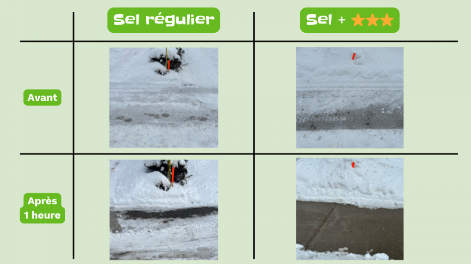 L'avenue Martin, elle, a plutôt été saupoudrée d’un mélange de sel et de fragments d'étoiles de mer. ⭐ Des photos ont été prises avant et après pour comparer l’efficacité des deux déglaçants.